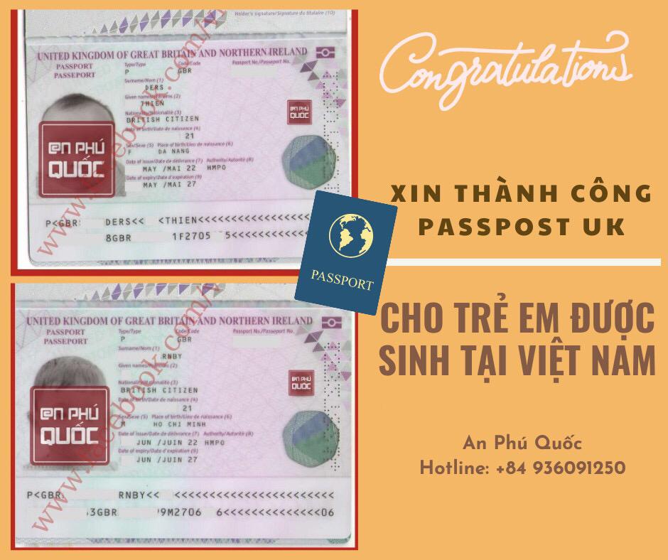 An Phú Quốc rất tự hào khi đã hỗ trợ khách hàng xin thành công hộ chiếu/quốc tịch UK cho các em bé sinh tại Việt Nam, gần đây nhất là các bé sinh tại Đà Nẵng, Hồ Chí Minh. Trong suốt quá trình thực hiện hồ sơ, cha mẹ chỉ cần chuẩn bị các giấy tờ theo danh sách mà An Phú Quốc đã gửi, không phải đi lại, di chuyển giữa các thành phố để tới Sứ quán. Thật là dễ dàng và thuận tiện phải không nào?