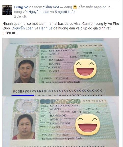 An Phú Quốc xin chúc mừng hai bác Trương Thị Sót và Võ Văn Xô đã có trong tay tấm visa Anh chỉ sau 1 tuần xét duyệt hồ sơ.