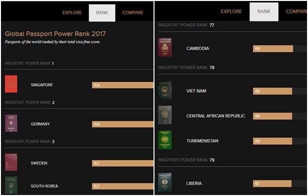 Hộ chiếu Việt Nam cũng bị tụt hạng, đứng vị trí 78 cùng Cộng hòa Trung Phi và Turkmenistan. Công dân Việt Nam được du lịch đến 48 nước và vùng lãnh thổ trên thế giới không cần xin thị thực hoặc thị thực tại sân bay đến.